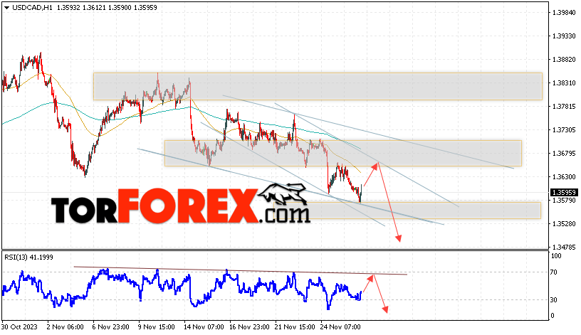 Таким образом, USD/CAD прогноз Канадский Доллар на 29 ноября 2023 предполагает попытку теста области сопротивления вблизи уровня 1.3655. Далее, продолжение падения в область ниже уровня 1.3485. Дополнительным сигналом в пользу снижения Канадского Доллара на Форекс выступит тест линии тренда на индикаторе относительной силы. Отменой варианта падения котировок USD/CAD станет сильный рот и пробой уровня 1.3705. Это укажет на продолжение подъёма стоимости актива с потенциальной целью выше уровня 1.3875.
