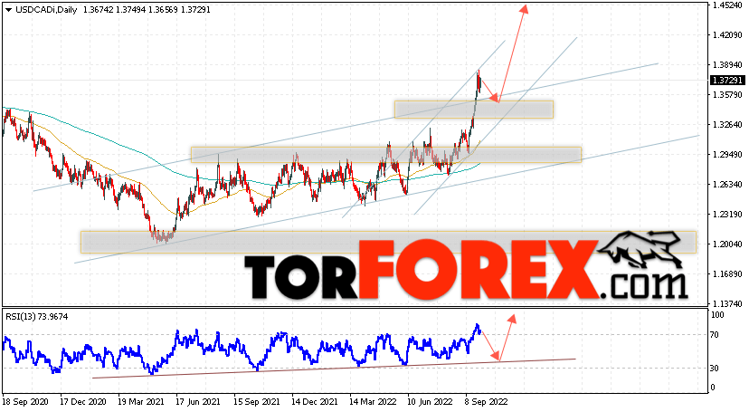 Дополнительным сигналом в пользу подъёма валютной пары USD/CAD выступит тест восходящей линии тренда на индикаторе относительной силы. Вторым сигналом станет отскок от верхней границы бычьего канала. Отменой варианта подъёма котировок валютной пары USD/CAD на текущей торговой на неделе 3 — 7 октября 2022 станет падение и пробой области 1.3245. Это укажет на пробой поддержки и продолжения падения в область ниже уровня 1.2665. Подтверждением подъёма по паре выступит пробой области сопротивления и закрытие цены над уровнем 1.3905.