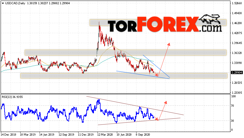 Таким образом, USD/CAD прогноз Канадский Доллар на 30 ноября — 4 декабря 2020 предполагает попытку теста области поддержки вблизи уровня 1.2935. Далее, продолжение роста с целью ниже уровня 1.3965. Дополнительным сигналом в пользу подъёма выступит тест линии тренда на индикаторе относительной силы. Отменой варианта развития роста станет падение и пробой области 1.2665. Это укажет на пробой нижней границы разворотной модели и продолжение падения пары с целью ниже 1.2445.