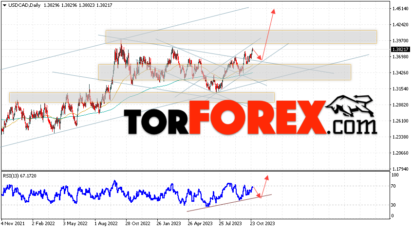 Таким образом, USD/CAD прогноз Канадский Доллар на 30 октября — 3 ноября 2023 предполагает попытку развития коррекции и теста области поддержки вблизи уровня 1.3685. Далее, продолжение падения с целью ниже уровня 1.4515. Дополнительным сигналом в пользу снижения выступит тест нисходящей линии тренда на индикаторе относительной силы. Отменой варианта развития падения станет сильный рост и пробой области 1.3135. Это укажет на пробой важного уровня сопротивления и продолжение подъёма с целью выше 1.2765.