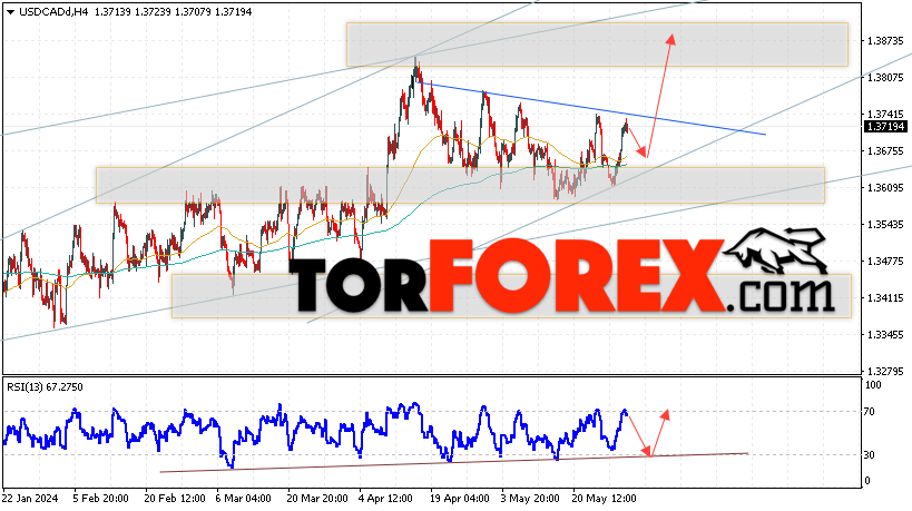 Таким образом, USD/CAD прогноз Канадский Доллар на 31 мая 2024 предполагает попытку теста области поддержки вблизи уровня 1.3665. Далее, продолжение роста в область выше уровня 1.3875. Дополнительным сигналом в пользу подъёма Канадского Доллара на Форекс выступит тест линии тренда на индикаторе относительной силы. Отменой варианта роста котировок USD/CAD станет падение и пробой уровня 1.3565. Это укажет на продолжение снижения стоимости актива с потенциальной целью ниже уровня 1.3285.
