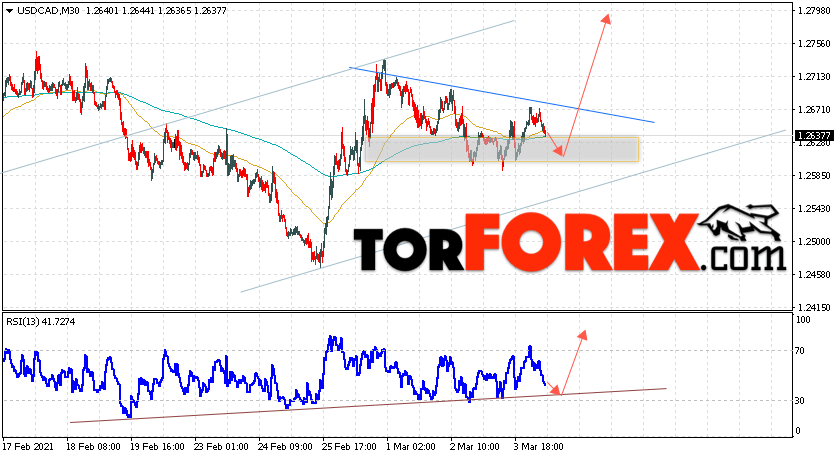 Таким образом, USD/CAD прогноз Канадский Доллар на 5 марта 2021 предполагает попытку теста области поддержки вблизи уровня 1.2595. Далее, продолжение роста в область выше уровня 1.2805. Дополнительным сигналом в пользу подъёма Канадского Доллара на Форекс выступит тест линии тренда на индикаторе относительной силы. Отменой варианта роста котировок USD/CAD станет падение и пробой уровня 1.2565. Это укажет на продолжение снижения стоимости актива с потенциальной целью ниже уровня 1.2265.