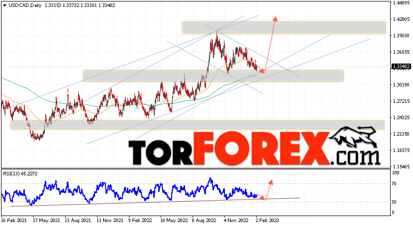 Дополнительным сигналом в пользу подъёма валютной пары USD/CAD выступит тест восходящей линии тренда на индикаторе относительной силы. Вторым сигналом станет отскок от нижней границы бычьего канала. Отменой варианта подъёма котировок валютной пары USD/CAD на текущей торговой на неделе 6 — 10 февраля 2023 станет падение и пробой области 1.2925. Это укажет на пробой поддержки и продолжения падения в область ниже уровня 1.2645. Подтверждением подъёма по паре выступит пробой области сопротивления и закрытие цены над уровнем 1.3645, что укажет на пробой верхней границы нисходящего канала коррекции.