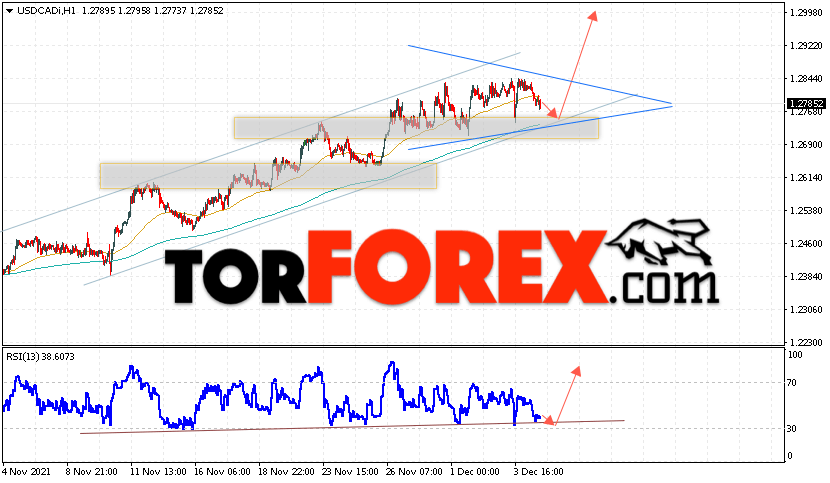 Дополнительным сигналом в пользу подъёма котировок Канадского Доллара выступит тест пробитой линии тренда на индикаторе относительной силы. Вторым сигналом в пользу подъёма станет отскок от нижней границы бычьего канала. Отменой варианта роста валютной пары USD/CAD на Форекс станет падение и пробой области 1.2655. Это укажет на пробой области поддержки и продолжение падения котировок в область ниже уровня 1.2475. Ожидать подтверждения подъёма пары стоит с пробоем области сопротивления и закрытием котировок пары USD/CAD выше уровня 1.2875, что укажет на пробой верхней границы модели ”Треугольник”.