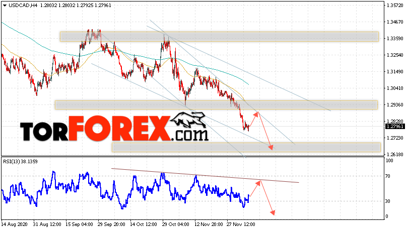 Дополнительным сигналом в пользу падения котировок Канадского Доллара выступит тест линии тренда на индикаторе относительной силы. Вторым сигналом в пользу снижения станет отскок от верхней границы нисходящего канала. Отменой варианта падения USD/CAD на Форекс станет сильный рост и пробой области 1.2965. Это укажет на пробой области сопротивления и продолжение роста котировок в область выше уровня 1.3145. Ожидать ускорения падения пары стоит с пробоем области поддержки и закрытием котировок пары USD/CAD ниже уровня 1.2725.
