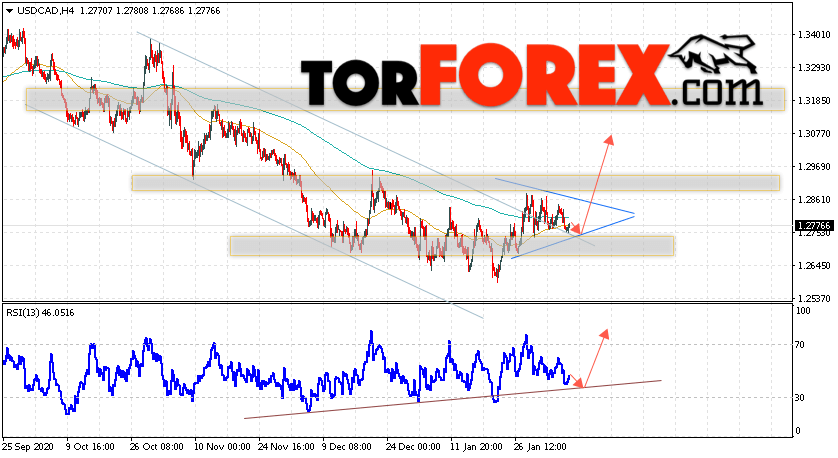 Дополнительным сигналом в пользу подъёма котировок Канадского Доллара выступит тест линии тренда на индикаторе относительной силы. Вторым сигналом в пользу роста станет отскок от нижней границы модели ”Треугольник”. Отменой варианта подъёма валютной пары USD/CAD на Форекс станет падение и пробой области 1.2655. Это укажет на пробой области поддержки и продолжение снижения котировок в область ниже уровня 1.2445. Ожидать подтверждения роста пары стоит с пробоем области сопротивления и закрытием котировок пары USD/CAD выше уровня 1.2905, что укажет на пробой верхней границы модели ”Треугольник”.