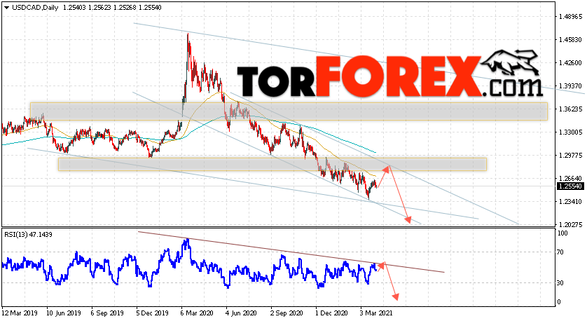 Дополнительным сигналом в пользу падения валютной пары USD/CAD выступит тест линии сопротивления на индикаторе относительной силы. Вторым сигналом станет отскок от верхней границы нисходящего канала. Отменой варианта снижения котировок валютной пары USD/CAD на текущей торговой на неделе 5 — 9 апреля 2021 станет сильный рост и пробой области 1.3035. Это укажет на пробой верхней границы нисходящего канала и продолжения роста в область выше уровня 1.3345. Подтверждением подъёма по паре выступит пробой области сопротивления и закрытие цены над уровнем 1.2335.