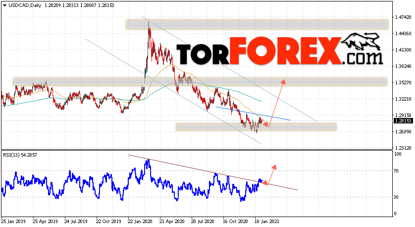 Дополнительным сигналом в пользу подъёма валютной пары USD/CAD выступит тест линии поддержки на индикаторе относительной силы. Вторым сигналом станет отскок от нижней границы модели ”Голова и плечи”. Отменой варианта роста котировок валютной пары USD/CAD на текущей торговой на неделю 8 — 12 февраля 2021 станет падение и пробой области 1.2435. Это укажет на пробой нижней границы модели и продолжения падения в область ниже уровня 1.2015. Подтверждением роста по паре выступит пробой области сопротивления и закрытие цены выше уровня 1.2945, что укажет на пробой верхней границы модели ”Голова и плечи”.
