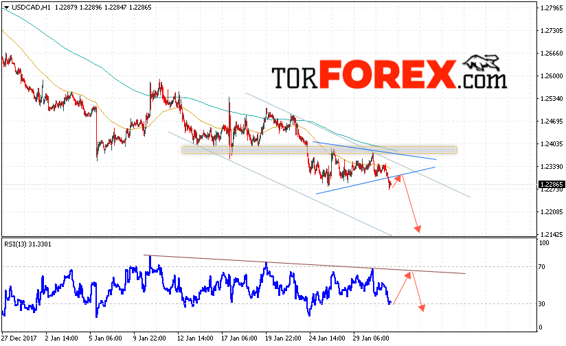 Таким образом, USD/CAD прогноз Канадский Доллар на 1 февраля 2018 предполагает попытку теста уровня 1.2315 и продолжения падения в область ниже уровня 1.2140, дополнительным сигналом в пользу падения выступит тест линии сопротивления на индикаторе относительной силы, отменой варианта падения Канадского Доллара станет пробой уровня 1.2440.