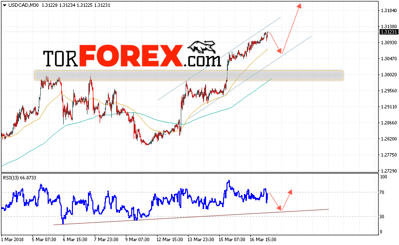 Таким образом, USD/CAD прогноз Канадский Доллар на 20 марта 2018 предполагает попытку теста уровня поддержки вблизи 1.3050 и продолжения роста в область выше уровня 1.3250, дополнительным сигналом в пользу роста выступит тест линии поддержки на индикаторе относительной силы, отменой варианта роста Канадского Доллара станет пробой уровня 1.3010.
