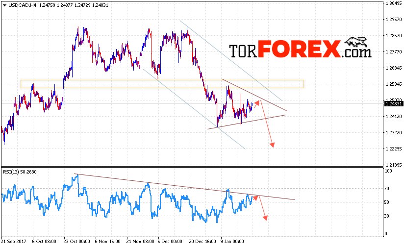 Таким образом, USD/CAD прогноз Канадский Доллар на 24 января 2018 предполагает попытку теста уровня 1.2500 и продолжения падения в область ниже уровня 1.2230, дополнительным сигналом в пользу падения выступит тест линии сопротивления на индикаторе относительной силы, отменой варианта падения Канадского Доллара станет пробой уровня 1.2580.