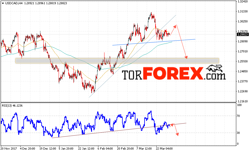 Таким образом, USD/CAD прогноз Канадский Доллар на 3 апреля 2018 предполагает попытку теста уровня сопротивления вблизи 1.2950 и продолжения падения в область ниже уровня 1.2590, дополнительным сигналом в пользу падения выступит тест линии тренда на индикаторе относительной силы, отменой варианта падения Канадского Доллара станет пробой уровня 1.3130.