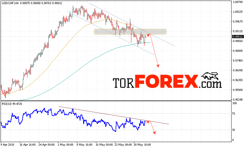 Таким образом, USD/CHF прогноз Доллар Франк на 5 июня 2018 предполагает попытку теста области сопротивления вблизи уровня 0.9890 и продолжение падения пары USD/CHF с целью ниже уровня 0.9770, дополнительным сигналом в пользу падения пары Доллар Франк выступит тест линии тренда на индикаторе относительной силы, отменой варианта падения станет сильный рост и пробой области 0.9940.
