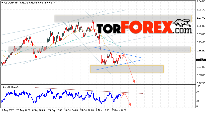 Таким образом, USD/CHF прогноз Доллар Франк на 1 декабря 2022 предполагает попытку развития коррекции и теста области сопротивления вблизи уровня 0.9525. Далее, продолжение падения валютной пары USD/CHF с целью выше уровня 0.9065. Дополнительным сигналом в пользу снижения пары Доллар Франк выступит отскок от линии тренда на индикаторе относительной силы. Отменой варианта падения станет сильный рост и пробой области 0.9665. Это укажет на пробой уровня сопротивления и продолжение подъёма пары с потенциальной целью выше уровня 0.9875.