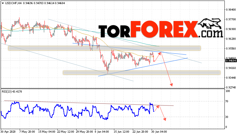 Таким образом, USD/CHF прогноз Доллар Франк на 1 июля 2020 предполагает попытку теста области сопротивления вблизи уровня 0.9505. Далее, продолжение падения валютной пары USD/CHF с целью ниже уровня 0.9275. Дополнительным сигналом в пользу снижения пары Доллар Франк выступит тест линии тренда на индикаторе относительной силы. Отменой варианта падения станет сильный рост и пробой области 0.9615. Это укажет на пробой уровня сопротивления и продолжение роста пары с потенциальной целью выше уровня 0.9785.