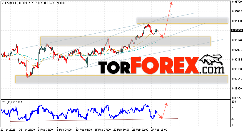 Таким образом, USD/CHF прогноз Доллар Франк на 1 марта 2023 предполагает попытку развития коррекции и теста области поддержки вблизи уровня 0.9325. Далее, продолжение роста валютной пары USD/CHF с целью выше уровня 0.9575. Дополнительным сигналом в пользу подъёма пары Доллар Франк выступит отскок от линии тренда на индикаторе относительной силы. Отменой варианта роста станет падение и пробой области 0.9205. Это укажет на пробой уровня поддержки и продолжение снижения пары с потенциальной целью ниже уровня 0.8925.