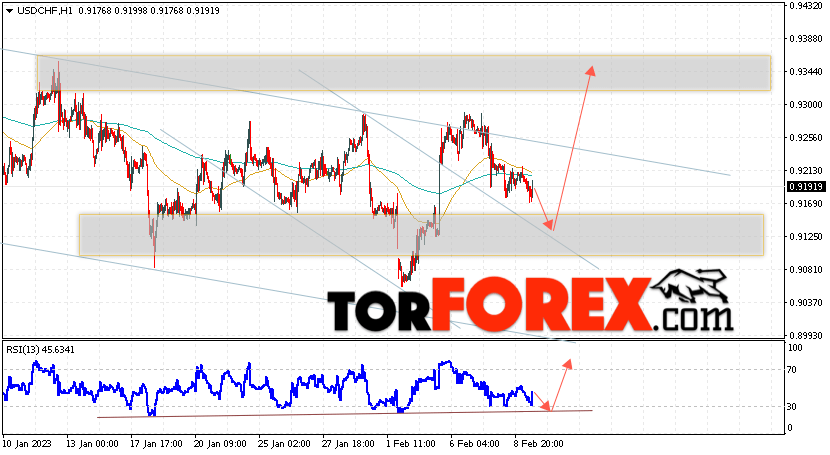 Таким образом, USD/CHF прогноз Доллар Франк на 10 февраля 2023 предполагает попытку развития коррекции и теста области поддержки вблизи уровня 0.9130. Далее, продолжение роста валютной пары USD/CHF с целью выше уровня 0.9345. Дополнительным сигналом в пользу подъёма пары Доллар Франк выступит отскок от линии тренда на индикаторе относительной силы. Отменой варианта роста станет падение и пробой области 0.9015. Это укажет на пробой уровня поддержки и продолжение падения пары с потенциальной целью ниже уровня 0.8795.