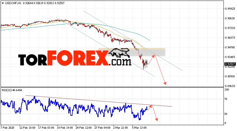 Таким образом, USD/CHF прогноз Доллар Франк на 10 марта 2020 предполагает попытку теста области сопротивления вблизи уровня 0.9345. Далее, продолжение падения валютной пары USD/CHF с целью ниже уровня 0.8965. Дополнительным сигналом в пользу снижения пары Доллар Франк выступит тест линии тренда на индикаторе относительной силы. Отменой варианта падения станет сильный рост и пробой области 0.9495. Это укажет на пробой уровня сопротивления и продолжение подъёма пары с потенциальной целью выше уровня 0.9655.
