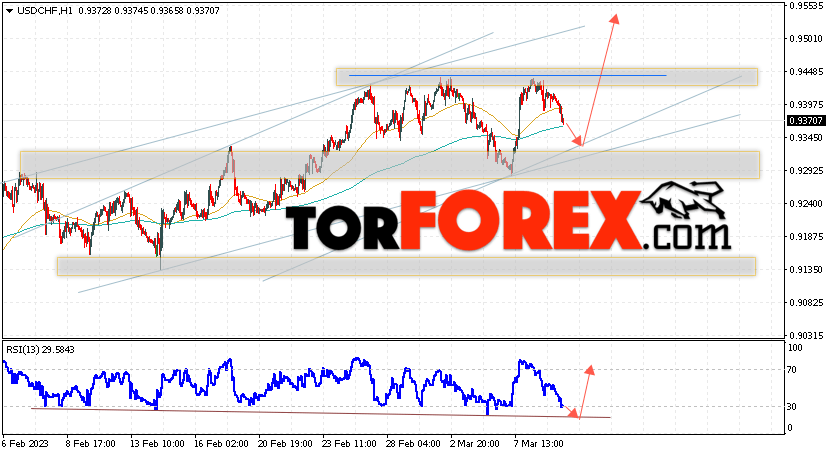 Таким образом, USD/CHF прогноз Доллар Франк на 10 марта 2023 предполагает попытку развития коррекции и теста области поддержки вблизи уровня 0.9335. Далее, продолжение роста валютной пары USD/CHF с целью выше уровня 0.9565. Дополнительным сигналом в пользу подъёма пары Доллар Франк выступит отскок от линии тренда на индикаторе относительной силы. Отменой варианта роста станет падение и пробой области 0.9245. Это укажет на пробой уровня поддержки и продолжение снижения пары с потенциальной целью ниже уровня 0.8935.