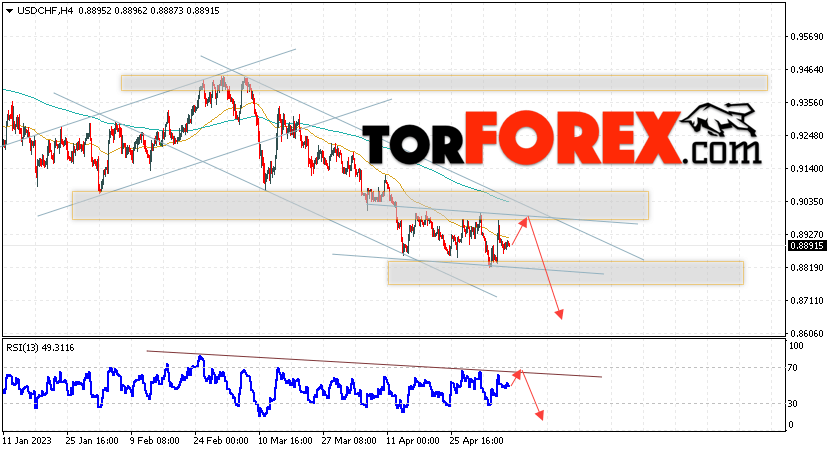 Таким образом, USD/CHF прогноз Доллар Франк на 10 мая 2023 предполагает попытку развития коррекции и теста области сопротивления вблизи уровня 0.8935. Далее, продолжение падения валютной пары USD/CHF с целью ниже уровня 0.8655. Дополнительным сигналом в пользу снижения пары Доллар Франк выступит отскок от линии тренда на индикаторе относительной силы. Отменой варианта падения станет сильный рост и пробой области 0.9045. Это укажет на пробой уровня сопротивления и продолжение роста пары с потенциальной целью выше уровня 0.9285.