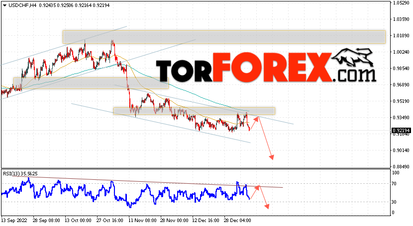 Таким образом, USD/CHF прогноз Доллар Франк на 10 января 2023 предполагает попытку развития коррекции и теста области сопротивления вблизи уровня 0.9345. Далее, продолжение падения валютной пары USD/CHF с целью ниже уровня 0.8965. Дополнительным сигналом в пользу снижения пары Доллар Франк выступит отскок от линии тренда на индикаторе относительной силы. Отменой варианта падения станет сильный рост и пробой области 0.9505. Это укажет на пробой уровня сопротивления и продолжение подъёма пары с потенциальной целью выше уровня 0.9775.