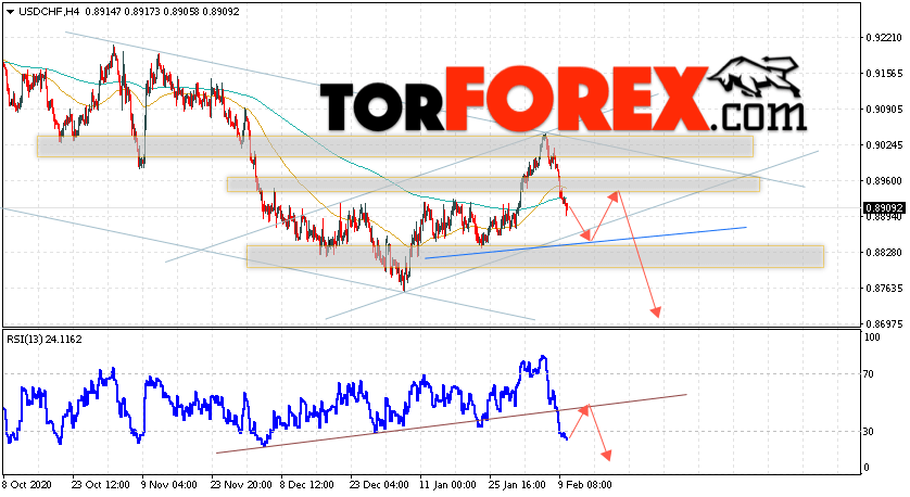 Таким образом, USD/CHF прогноз Доллар Франк на 11 февраля 2021 предполагает попытку теста области поддержки вблизи уровня 0.8845. Далее, продолжение роста валютной пары USD/CHF с целью выше уровня 0.8975. Дополнительным сигналом в пользу подъёма пары Доллар Франк выступит тест линии тренда на индикаторе относительной силы. Отменой варианта роста станет падение и пробой области 0.8805. Это укажет на пробой уровня поддержки и продолжение падения пары с потенциальной целью ниже уровня 0.8685.