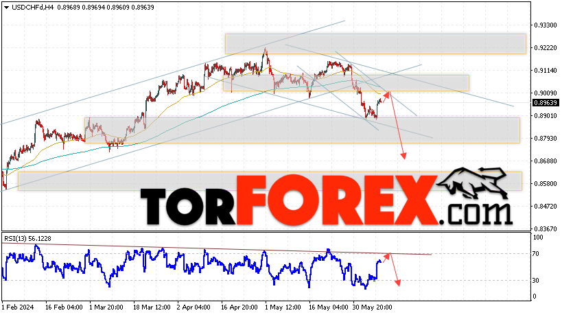 Таким образом, USD/CHF прогноз Доллар Франк на 11 июня 2024 предполагает попытку развития развития бычьей коррекции и теста области сопротивления вблизи уровня 0.8995. Далее, продолжение падения валютной пары USD/CHF с целью ниже уровня 0.8685. Дополнительным сигналом в пользу снижения пары Доллар Франк выступит отскок от линии тренда на индикаторе относительной силы. Отменой варианта падения станет сильный рост и пробой области 0.9065. Это укажет на пробой уровня сопротивления и продолжение подъёма пары с потенциальной целью выше уровня 0.9285.