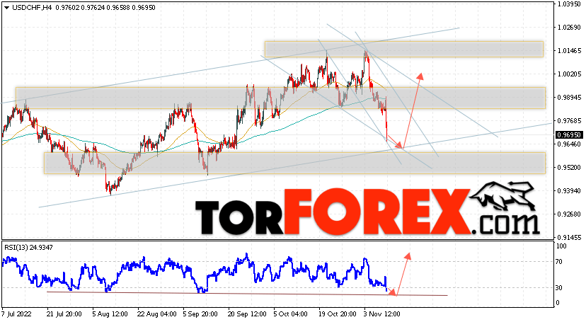 Таким образом, USD/CHF прогноз Доллар Франк на 11 ноября 2022 предполагает попытку развития коррекции и теста области поддержки вблизи уровня 0.9635. Далее, продолжение роста валютной пары USD/CHF с целью выше уровня 1.0035. Дополнительным сигналом в пользу подъёма пары Доллар Франк выступит отскок от линии тренда на индикаторе относительной силы. Отменой варианта роста станет падение и пробой области 0.9535. Это укажет на пробой уровня поддержки и продолжение падения пары с потенциальной целью ниже уровня 0.9125.