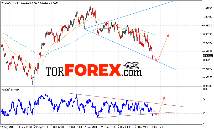 Таким образом, USD/CHF прогноз Доллар Франк на 11 января 2019 предполагает попытку теста области поддержки вблизи уровня 0.9715. Далее, продолжение роста пары USD/CHF с целью выше уровня 0.9915. Дополнительным сигналом в пользу подъёма пары Доллар Франк выступит тест линии поддержки на индикаторе относительной силы. Отменой варианта роста станет падение и пробой области 0.9665. Это укажет на пробой области поддержки и продолжение падения пары.