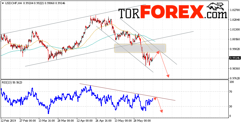Таким образом, USD/CHF прогноз Доллар Франк на 12 июня 2019 предполагает попытку теста области сопротивления вблизи уровня 0.9965. Далее, продолжение падения валютной пары USD/CHF с целью ниже уровня 0.9765. Дополнительным сигналом в пользу падения пары Доллар Франк выступит тест линии сопротивления на индикаторе относительной силы. Отменой варианта падения станет сильный рост и пробой области 1.0020. Это укажет на пробой уровня сопротивления и продолжение подъёма пары с потенциальной целью выше уровня 1.0135.