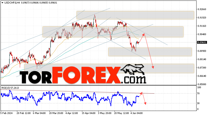 Таким образом, USD/CHF прогноз Доллар Франк на 12 июня 2024 предполагает попытку развития развития бычьей коррекции и теста области сопротивления вблизи уровня 0.9035. Далее, продолжение падения валютной пары USD/CHF с целью ниже уровня 0.8735. Дополнительным сигналом в пользу снижения пары Доллар Франк выступит отскок от линии тренда на индикаторе относительной силы. Отменой варианта падения станет сильный рост и пробой области 0.9075. Это укажет на пробой уровня сопротивления и продолжение подъёма пары с потенциальной целью выше уровня 0.9295.