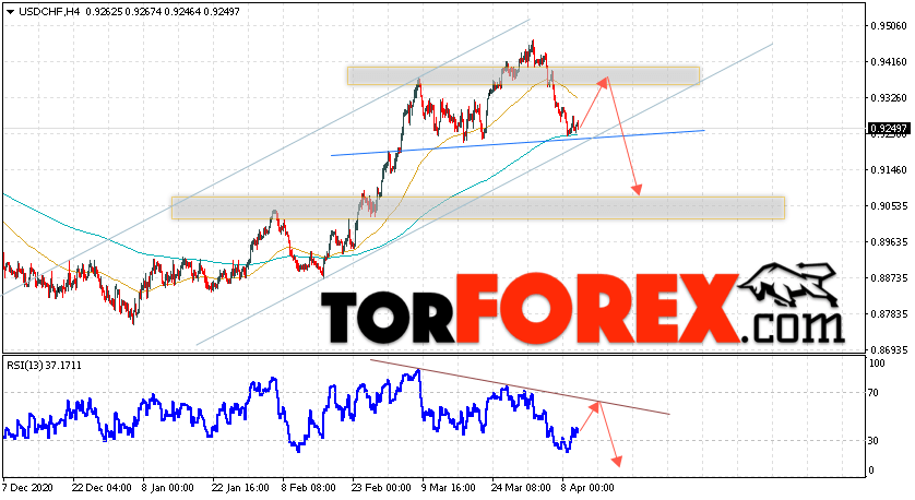 Таким образом, USD/CHF прогноз Доллар Франк на 13 апреля 2021 предполагает попытку теста области сопротивления вблизи уровня 0.9345. Далее, продолжение падения валютной пары USD/CHF с целью ниже уровня 0.9065. Дополнительным сигналом в пользу падения пары Доллар Франк выступит тест линии тренда на индикаторе относительной силы. Отменой варианта падения станет сильный рост и пробой области 0.9535. Это укажет на пробой уровня сопротивления и продолжение подъёма пары с потенциальной целью выше уровня 0.9775.