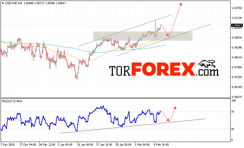 Таким образом, USD/CHF прогноз Доллар Франк на 13 февраля 2019 предполагает попытку теста области поддержки вблизи уровня 0.9995. Далее, продолжение роста пары USD/CHF с целью выше уровня 1.0185. Дополнительным сигналом в пользу роста пары Доллар Франк выступит тест линии поддержки на индикаторе относительной силы. Отменой варианта роста станет падение и пробой области 0.9935. Это укажет на пробой нижней границы нисходящего канала и продолжение снижения пары.