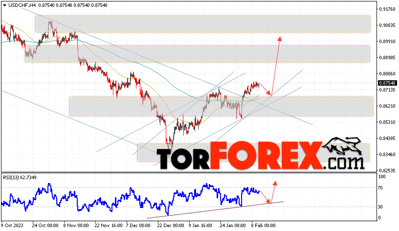 Таким образом, USD/CHF прогноз Доллар Франк на 13 февраля 2024 предполагает попытку развития коррекции и теста области поддержки вблизи уровня 0.8695. Далее, продолжение роста валютной пары USD/CHF с целью выше уровня 0.8995. Дополнительным сигналом в пользу подъёма пары Доллар Франк выступит отскок от линии тренда на индикаторе относительной силы. Отменой варианта роста станет падение и пробой области 0.8585. Это укажет на пробой уровня поддержки и продолжение падения пары с потенциальной целью ниже уровня 0.8365.