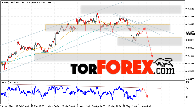 Таким образом, USD/CHF прогноз Доллар Франк на 13 июня 2024 предполагает попытку развития развития бычьей коррекции и теста области сопротивления вблизи уровня 0.9025. Далее, продолжение падения валютной пары USD/CHF с целью ниже уровня 0.8705. Дополнительным сигналом в пользу снижения пары Доллар Франк выступит отскок от линии тренда на индикаторе относительной силы. Отменой варианта падения станет сильный рост и пробой области 0.9105. Это укажет на пробой уровня сопротивления и продолжение подъёма пары с потенциальной целью выше уровня 0.9285.