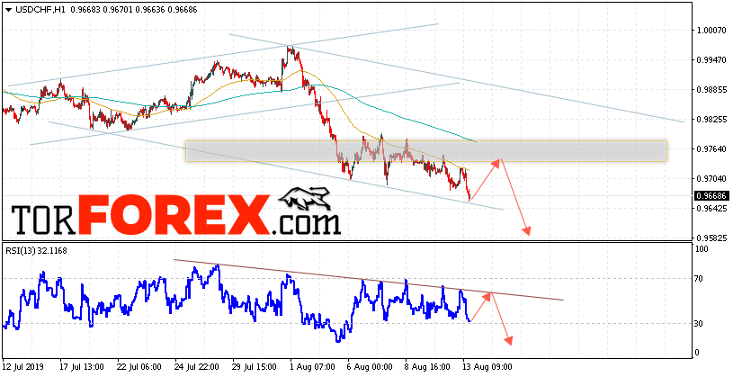 Таким образом, USD/CHF прогноз Доллар Франк на 14 августа 2019 предполагает попытку теста области сопротивления вблизи уровня 0.9750. Далее, продолжение падения валютной пары USD/CHF с целью ниже уровня 0.9585. Дополнительным сигналом в пользу снижения пары Доллар Франк выступит тест нисходящей линии тренда на индикаторе относительной силы. Отменой варианта падения станет сильный рост и пробой области 0.9815. Это укажет на пробой уровня сопротивления и продолжение роста пары с потенциальной целью выше уровня 0.9945.