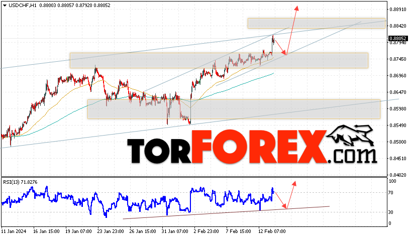 Таким образом, USD/CHF прогноз Доллар Франк на 14 февраля 2024 предполагает попытку развития коррекции и теста области поддержки вблизи уровня 0.8745. Далее, продолжение роста валютной пары USD/CHF с целью выше уровня 0.8905. Дополнительным сигналом в пользу подъёма пары Доллар Франк выступит отскок от линии тренда на индикаторе относительной силы. Отменой варианта роста станет падение и пробой области 0.8705. Это укажет на пробой уровня поддержки и продолжение падения пары с потенциальной целью ниже уровня 0.8475.