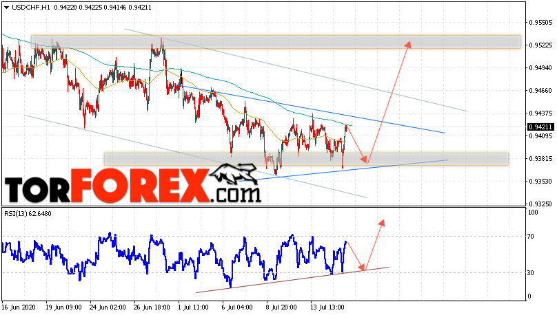 Таким образом, USD/CHF прогноз Доллар Франк на 16 июля 2020 предполагает попытку теста области поддержки вблизи уровня 0.9375. Далее, продолжение роста валютной пары USD/CHF с целью выше уровня 0.9525. Дополнительным сигналом в пользу подъёма пары Доллар Франк выступит тест линии тренда на индикаторе относительной силы. Отменой варианта роста станет падение и пробой области 0.9325. Это укажет на пробой уровня поддержки и продолжение падения пары с потенциальной целью ниже уровня 0.9205.