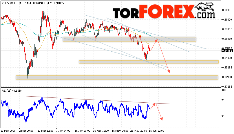 Дополнительным сигналом в пользу падения валютной пары Доллар Франк на FOREX выступит тест нисходящей линии тренда на индикаторе относительной силы. Вторым сигналом станет отскок от верхней границы нисходящего канала. Отменой варианта падения пары USD/CHF на Форекс станет сильный рост и пробой области 0.9665. Это укажет на пробой области сопротивления и продолжение роста котировок USD/CHF в область выше уровня 0.9965. Ожидать подтверждение падения котировок USD/CHF стоит с пробоем области поддержки и закрытием ниже уровня 0.9405.