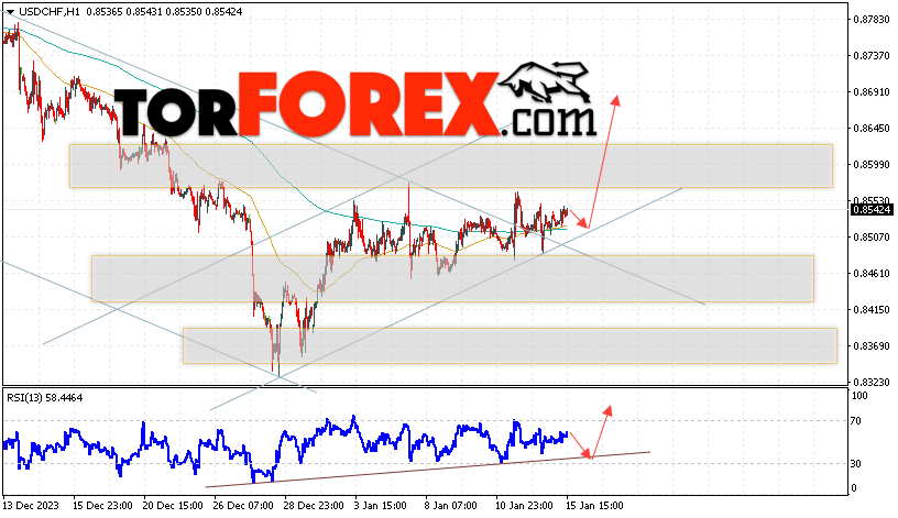 Таким образом, USD/CHF прогноз Доллар Франк на 16 января 2024 предполагает попытку развития коррекции и теста области поддержки вблизи уровня 0.8525. Далее, продолжение роста валютной пары USD/CHF с целью выше уровня 0.8695. Дополнительным сигналом в пользу подъёма пары Доллар Франк выступит отскок от линии тренда на индикаторе относительной силы. Отменой варианта роста станет падение и пробой области 0.8445. Это укажет на пробой уровня поддержки и продолжение падения пары с потенциальной целью ниже уровня 0.8235.