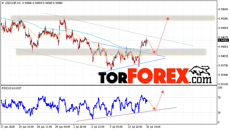 Таким образом, USD/CHF прогноз Доллар Франк на 17 июля 2020 предполагает попытку теста области поддержки вблизи уровня 0.9405. Далее, продолжение роста валютной пары USD/CHF с целью выше уровня 0.9545. Дополнительным сигналом в пользу подъёма пары Доллар Франк выступит тест линии тренда на индикаторе относительной силы. Отменой варианта роста станет падение и пробой области 0.9335. Это укажет на пробой уровня поддержки и продолжение падения пары с потенциальной целью ниже уровня 0.9215.