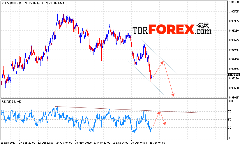 Таким образом, USD/CHF прогноз Доллар Франк на 17 января 2018 предполагает попытку теста верхней границы канала вблизи уровня 0.9735 и продолжение падения пары USD/CHF с целью ниже уровня 0.9520, дополнительным сигналом в пользу падения пары Доллар Франк выступит тест линии сопротивления на индикаторе относительной силы.