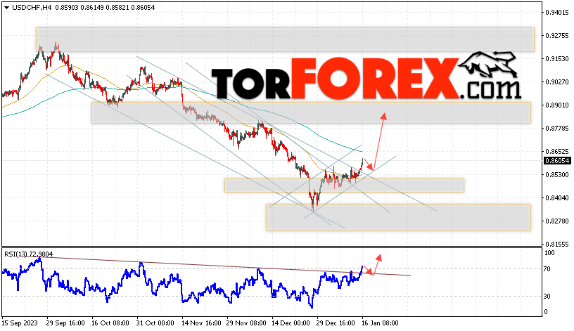 Таким образом, USD/CHF прогноз Доллар Франк на 17 января 2024 предполагает попытку развития коррекции и теста области поддержки вблизи уровня 0.8525. Далее, продолжение роста валютной пары USD/CHF с целью выше уровня 0.8695. Дополнительным сигналом в пользу подъёма пары Доллар Франк выступит отскок от линии тренда на индикаторе относительной силы. Отменой варианта роста станет падение и пробой области 0.8435. Это укажет на пробой уровня поддержки и продолжение падения пары с потенциальной целью ниже уровня 0.8215.