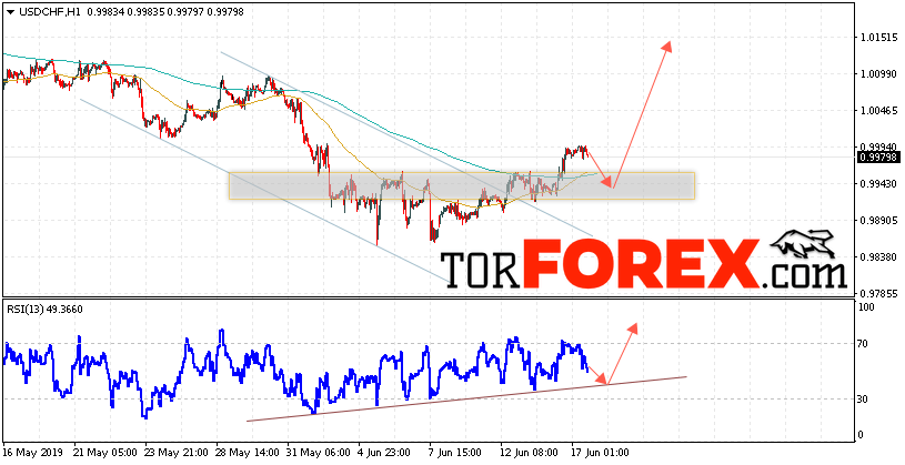 Таким образом, USD/CHF прогноз Доллар Франк на 18 июня 2019 предполагает попытку теста области поддержки вблизи уровня 0.9940. Далее, продолжение роста валютной пары USD/CHF с целью выше уровня 1.0145. Дополнительным сигналом в пользу подъёма пары Доллар Франк выступит тест линии поддержки на индикаторе относительной силы. Отменой варианта роста станет падение и пробой области 0.9870. Это укажет на пробой уровня поддержки и продолжение роста пары с потенциальной целью ниже уровня 0.9765.