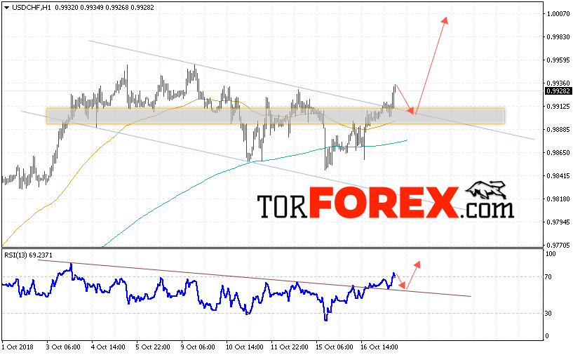 Таким образом, USD/CHF прогноз Доллар Франк на 18 октября 2018 предполагает попытку теста области поддержки вблизи уровня 0.9905 и продолжение роста пары USD/CHF с целью выше уровня 1.0010, дополнительным сигналом в пользу роста пары Доллар Франк выступит тест линии тренда на индикаторе относительной силы, отменой варианта роста станет падение и пробой области 0.9840, что укажет на пробой уровня поддержки и продолжение снижения пары.