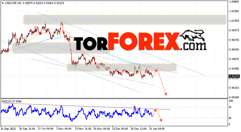 Таким образом, USD/CHF прогноз Доллар Франк на 18 января 2023 предполагает попытку развития коррекции и теста области сопротивления вблизи уровня 0.9305. Далее, продолжение падения валютной пары USD/CHF с целью ниже уровня 0.8845. Дополнительным сигналом в пользу снижения пары Доллар Франк выступит отскок от линии тренда на индикаторе относительной силы. Отменой варианта падения станет сильный рост и пробой области 0.9405. Это укажет на пробой уровня сопротивления и продолжение подъёма пары с потенциальной целью выше уровня 0.9575.