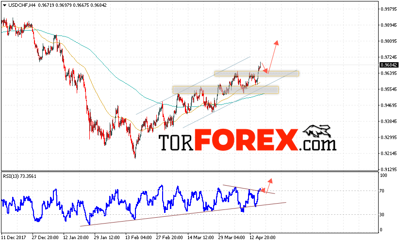Таким образом, USD/CHF прогноз Доллар Франк на 19 апреля 2018 предполагает попытку теста области поддержки вблизи уровня 0.9640 и продолжение роста пары USD/CHF с целью выше уровня 0.9810, дополнительным сигналом в пользу роста пары Доллар Франк выступит тест линии тренда на индикаторе относительной силы, отменой варианта роста станет падение и пробой области 0.9610.