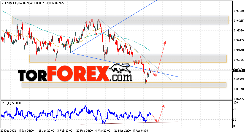 Таким образом, USD/CHF прогноз Доллар Франк на 19 апреля 2023 предполагает попытку развития коррекции и теста области поддержки вблизи уровня 0.8925. Далее, продолжение роста валютной пары USD/CHF с целью выше уровня 0.9275. Дополнительным сигналом в пользу подъёма пары Доллар Франк выступит отскок от линии тренда на индикаторе относительной силы. Отменой варианта роста станет падение и пробой области 0.8805. Это укажет на пробой уровня поддержки и продолжение падения пары с потенциальной целью ниже уровня 0.8635.