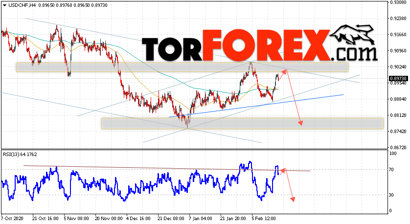 Таким образом, USD/CHF прогноз Доллар Франк на 19 февраля 2021 предполагает попытку теста области сопротивления вблизи уровня 0.9005. Далее, продолжение падения валютной пары USD/CHF с целью ниже уровня 0.8755. Дополнительным сигналом в пользу снижения пары Доллар Франк выступит тест линии тренда на индикаторе относительной силы. Отменой варианта падения станет сильный рост и пробой области 0.9085. Это укажет на пробой уровня сопротивления и продолжение подъёма пары с потенциальной целью выше уровня 0.9295.