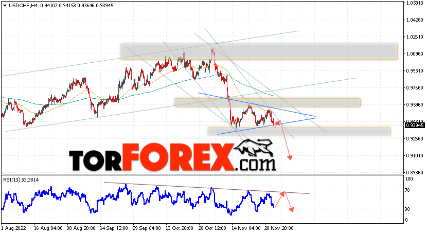 Таким образом, USD/CHF прогноз Доллар Франк на 2 декабря 2022 предполагает попытку развития коррекции и теста области сопротивления вблизи уровня 0.9435. Далее, продолжение падения валютной пары USD/CHF с целью выше уровня 0.9095. Дополнительным сигналом в пользу снижения пары Доллар Франк выступит отскок от линии тренда на индикаторе относительной силы. Отменой варианта падения станет сильный рост и пробой области 0.9655. Это укажет на пробой уровня сопротивления и продолжение подъёма пары с потенциальной целью выше уровня 0.9885.